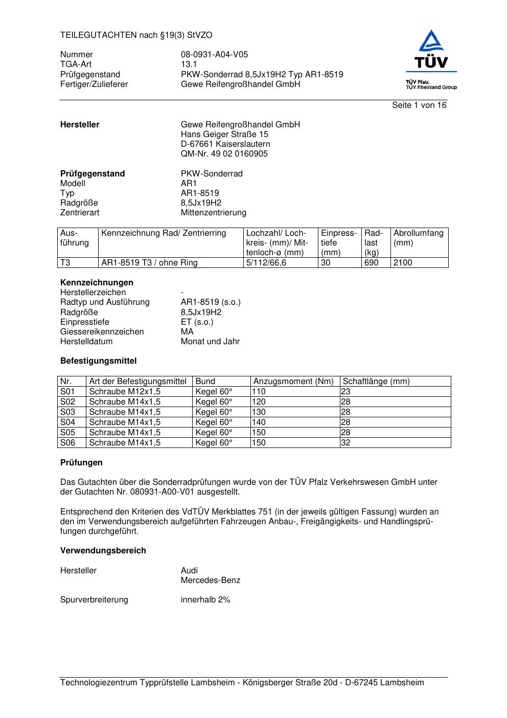 teilegutachten 08-0931-a04-v05 Gewe Reifengro grohandel GmbH AR1-8519