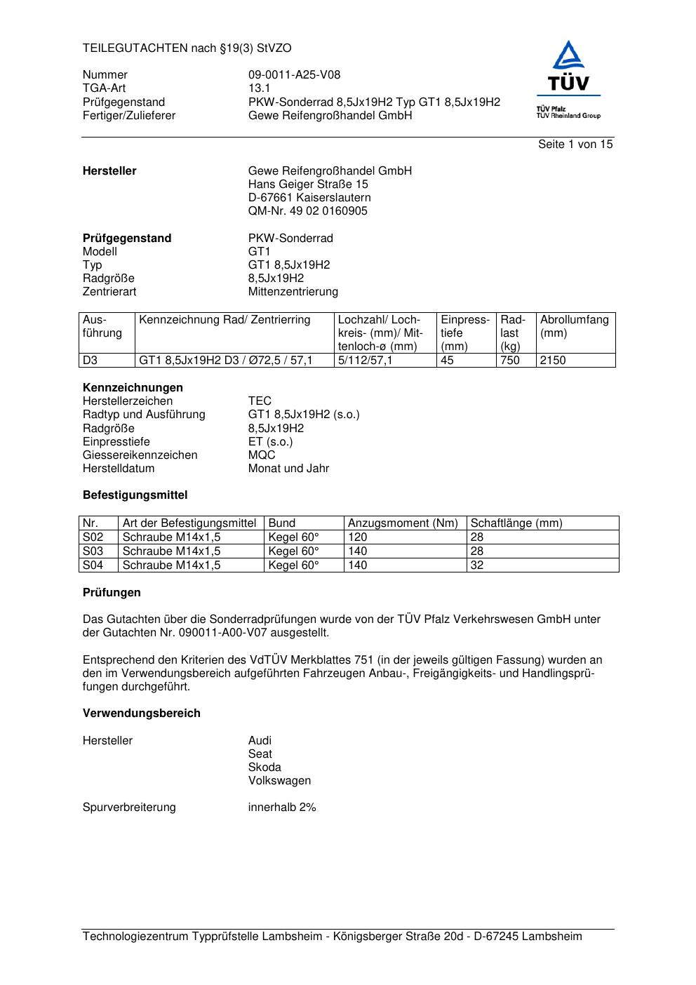 teilegutachten 09-0011-a25-v08 GEWE GT1
