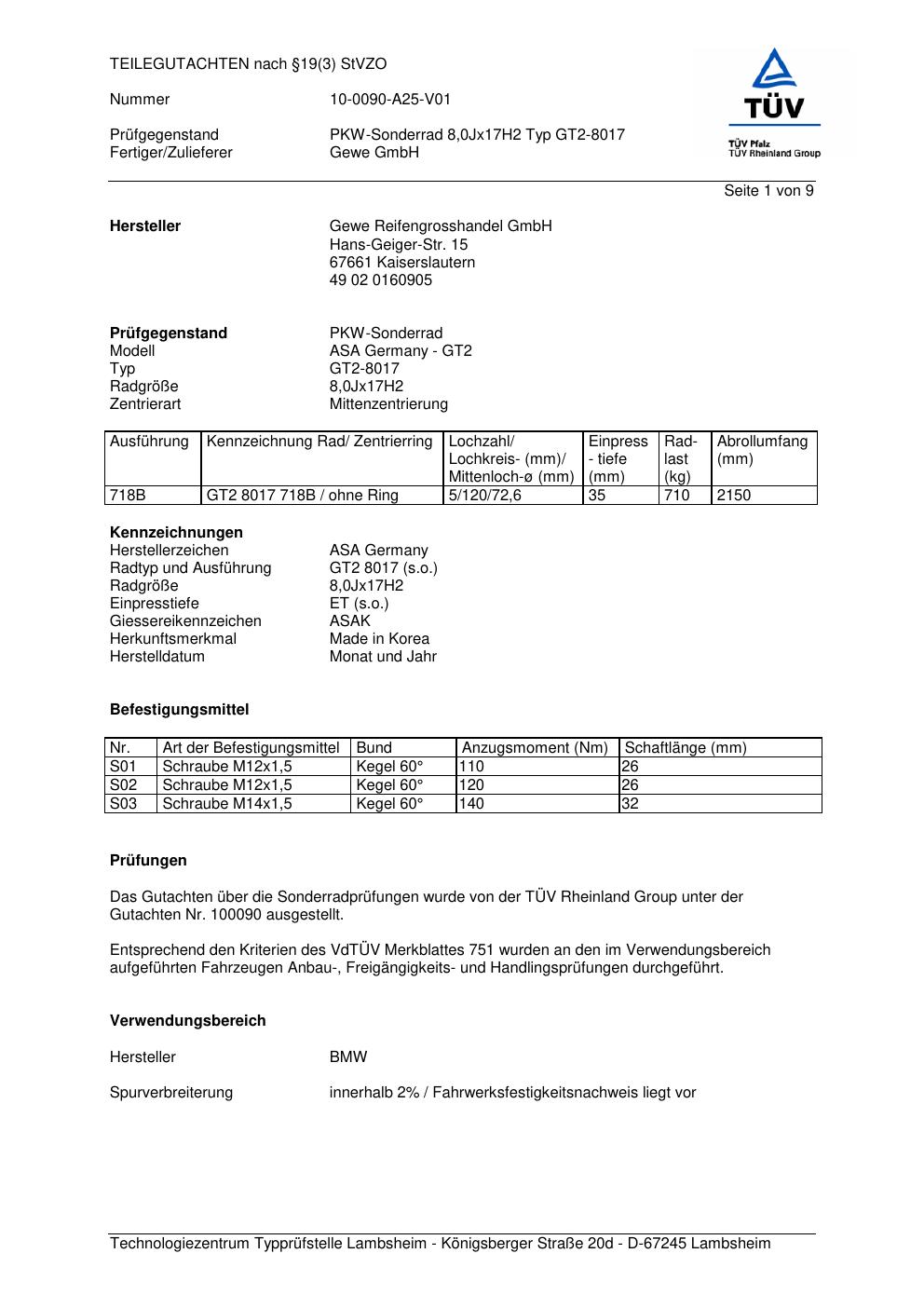 teilegutachten 100090 GEWE GT2-8017