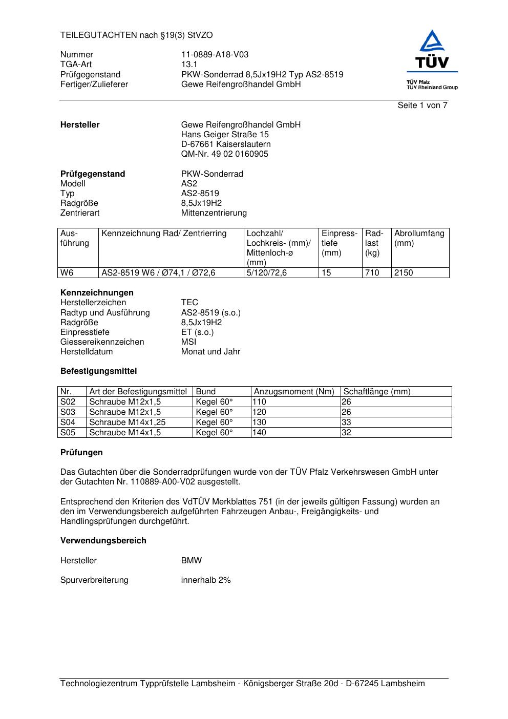 Felgengutachten / teilegutachten für Alufelgen GEWE AS2-8519 (ET 0, Mittenloch 0 mm) (Zertifikatsnummer 11-0889-a18-v03). Hier kostenlos als PDF herunterladen. Der Download-Link ist 24 Stunden gültig und kann bis zu zwei Mal verwendet werden.