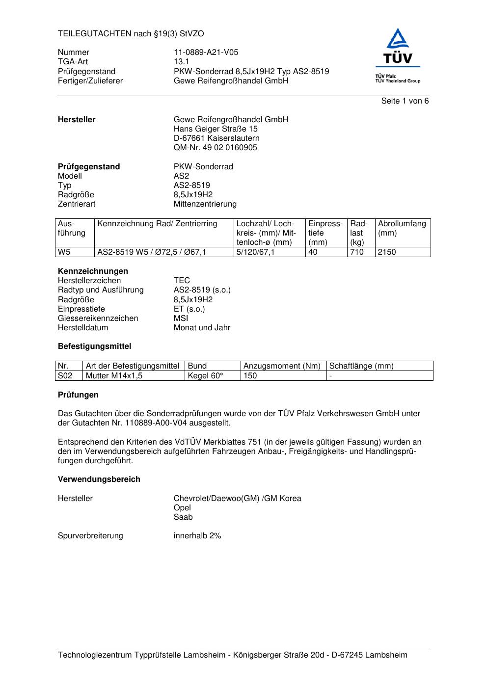 Felgengutachten / teilegutachten für Alufelgen GEWE AS2-8519 (ET 0, Mittenloch 0 mm) (Zertifikatsnummer 11-0889-a21-v05). Hier kostenlos als PDF herunterladen. Der Download-Link ist 24 Stunden gültig und kann bis zu zwei Mal verwendet werden.