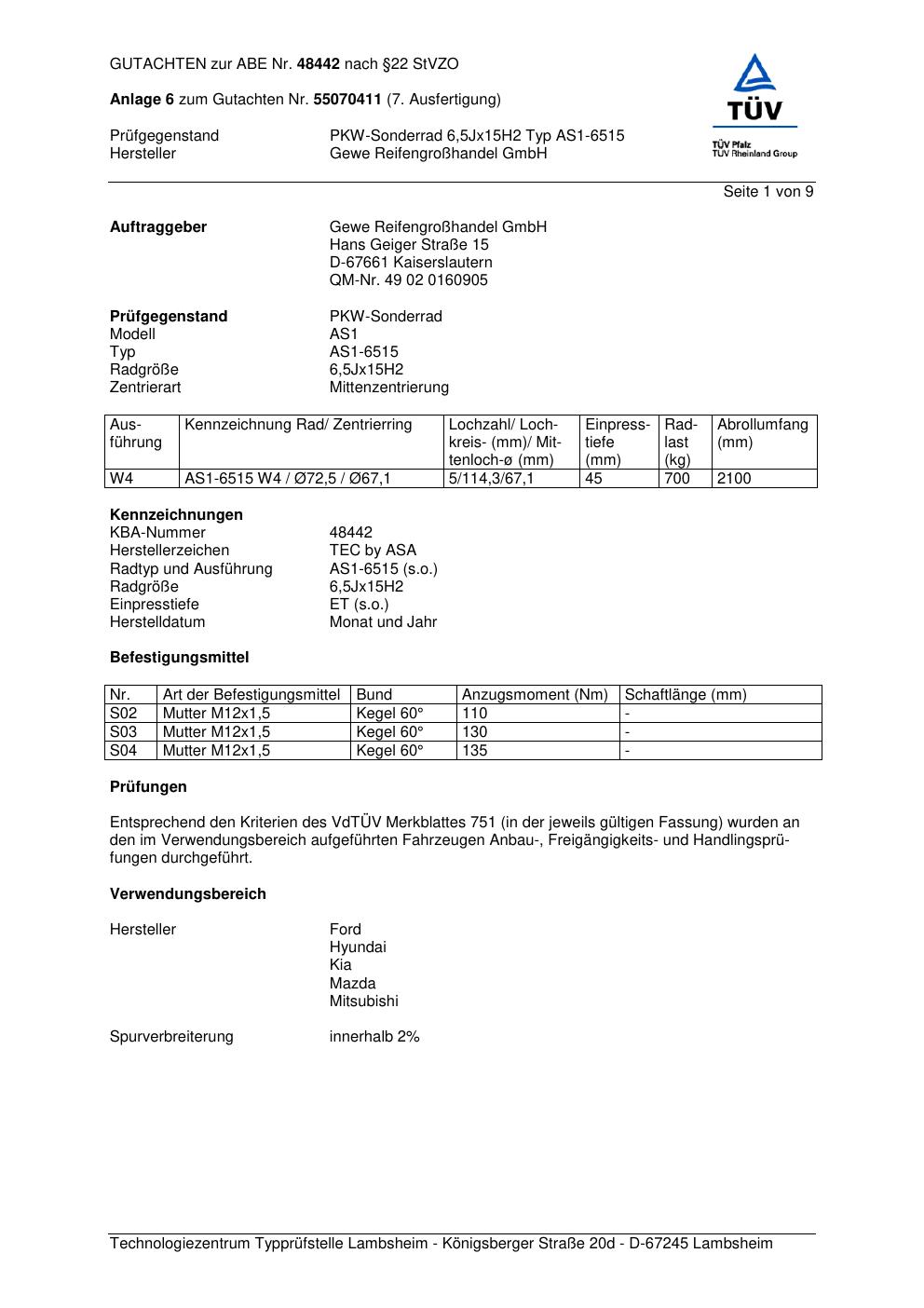 Dieses Gutachten (abe) bezieht sich auf die Alufelge GEWE AS1-6515 in der Ausführung ET 0, Mittenloch 0 mm (KBA 48442). Im PDF findest du typischerweise zulässige Reifengrößen, Auflagen/Anbauhinweise und – je nach Dokument – Hinweise zur Eintragung.