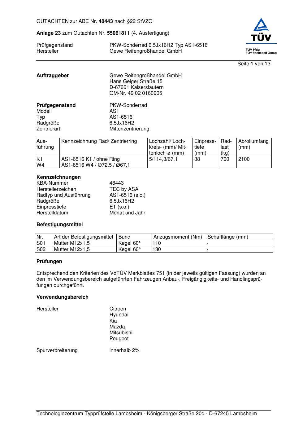 Dieses Gutachten (abe) bezieht sich auf die Alufelge GEWE AS1-6516 in der Ausführung ET 0, Mittenloch 0 mm (KBA 48443). Im PDF findest du typischerweise zulässige Reifengrößen, Auflagen/Anbauhinweise und – je nach Dokument – Hinweise zur Eintragung.