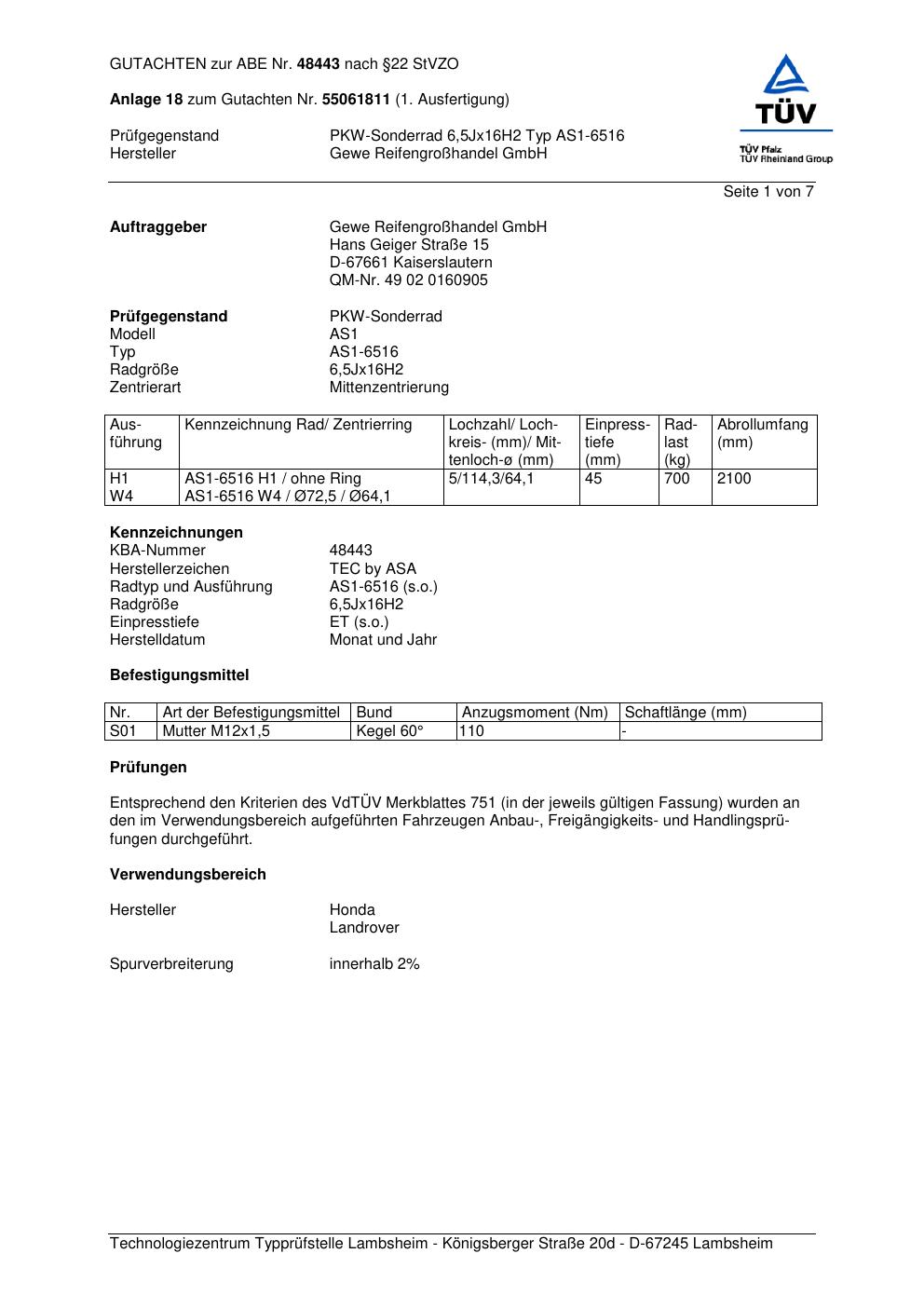 Dieses Gutachten (abe) bezieht sich auf die Alufelge GEWE AS1-6516 in der Ausführung ET 0, Mittenloch 0 mm (KBA 48443). Im PDF findest du typischerweise zulässige Reifengrößen, Auflagen/Anbauhinweise und – je nach Dokument – Hinweise zur Eintragung.