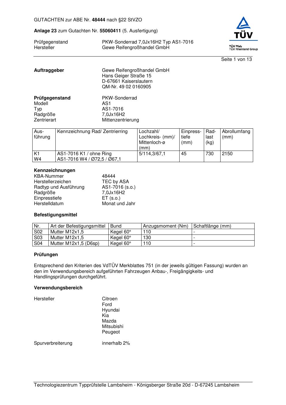 Dieses Gutachten (abe) bezieht sich auf die Alufelge GEWE AS1-7016 in der Ausführung ET 0, Mittenloch 0 mm (KBA 48444). Im PDF findest du typischerweise zulässige Reifengrößen, Auflagen/Anbauhinweise und – je nach Dokument – Hinweise zur Eintragung.