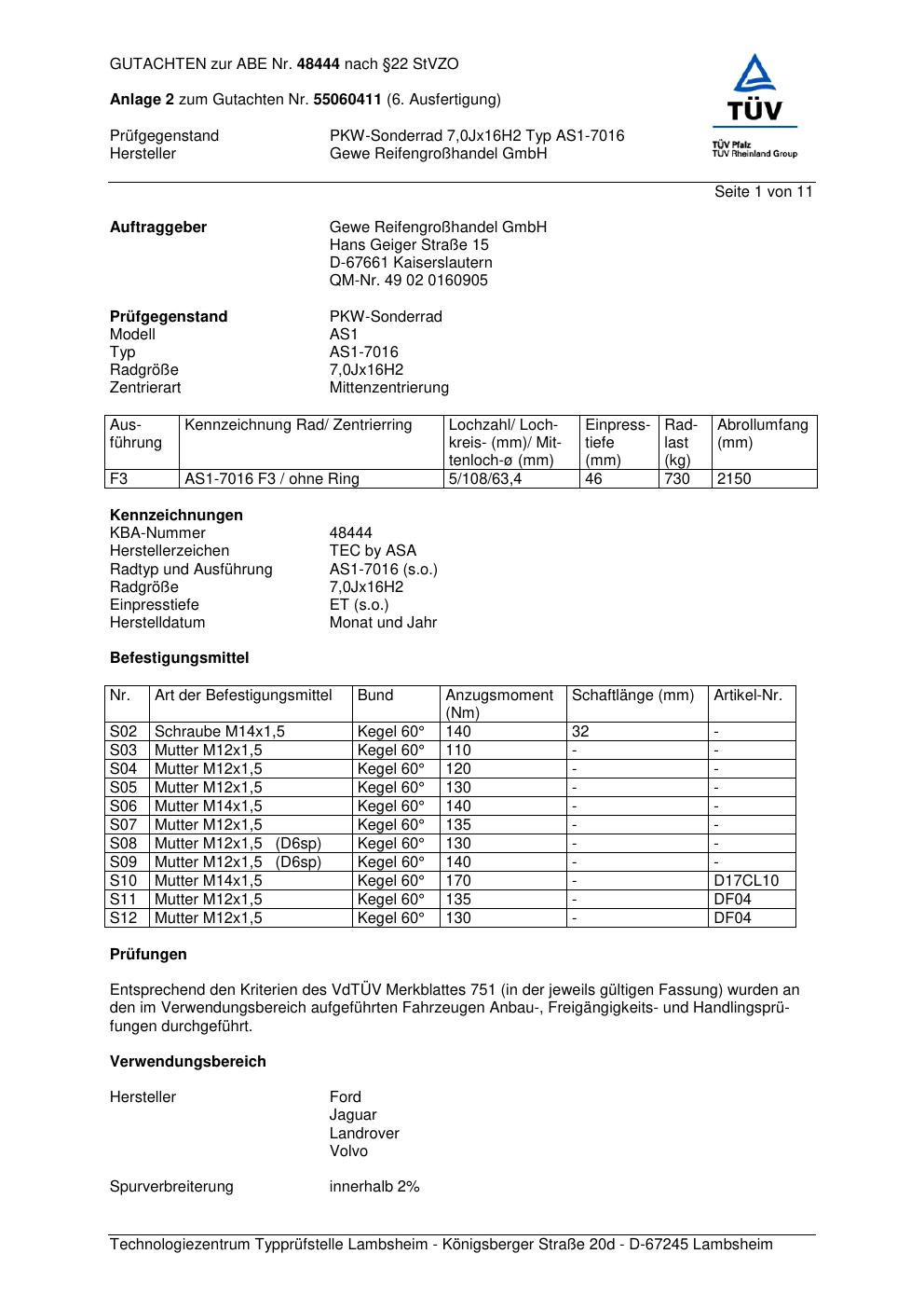 Dieses Gutachten (abe) bezieht sich auf die Alufelge GEWE AS1-7016 in der Ausführung ET 0, Mittenloch 0 mm (KBA 48444). Im PDF findest du typischerweise zulässige Reifengrößen, Auflagen/Anbauhinweise und – je nach Dokument – Hinweise zur Eintragung.