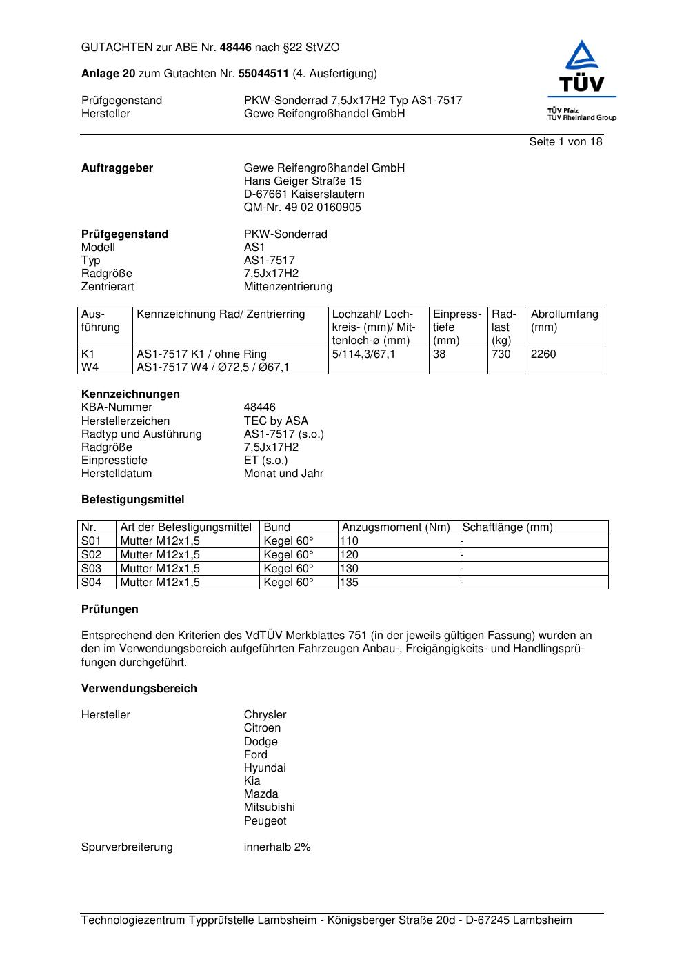 Dieses Gutachten (abe) bezieht sich auf die Alufelge GEWE AS1-7517 in der Ausführung ET 0, Mittenloch 0 mm (KBA 48446). Im PDF findest du typischerweise zulässige Reifengrößen, Auflagen/Anbauhinweise und – je nach Dokument – Hinweise zur Eintragung.