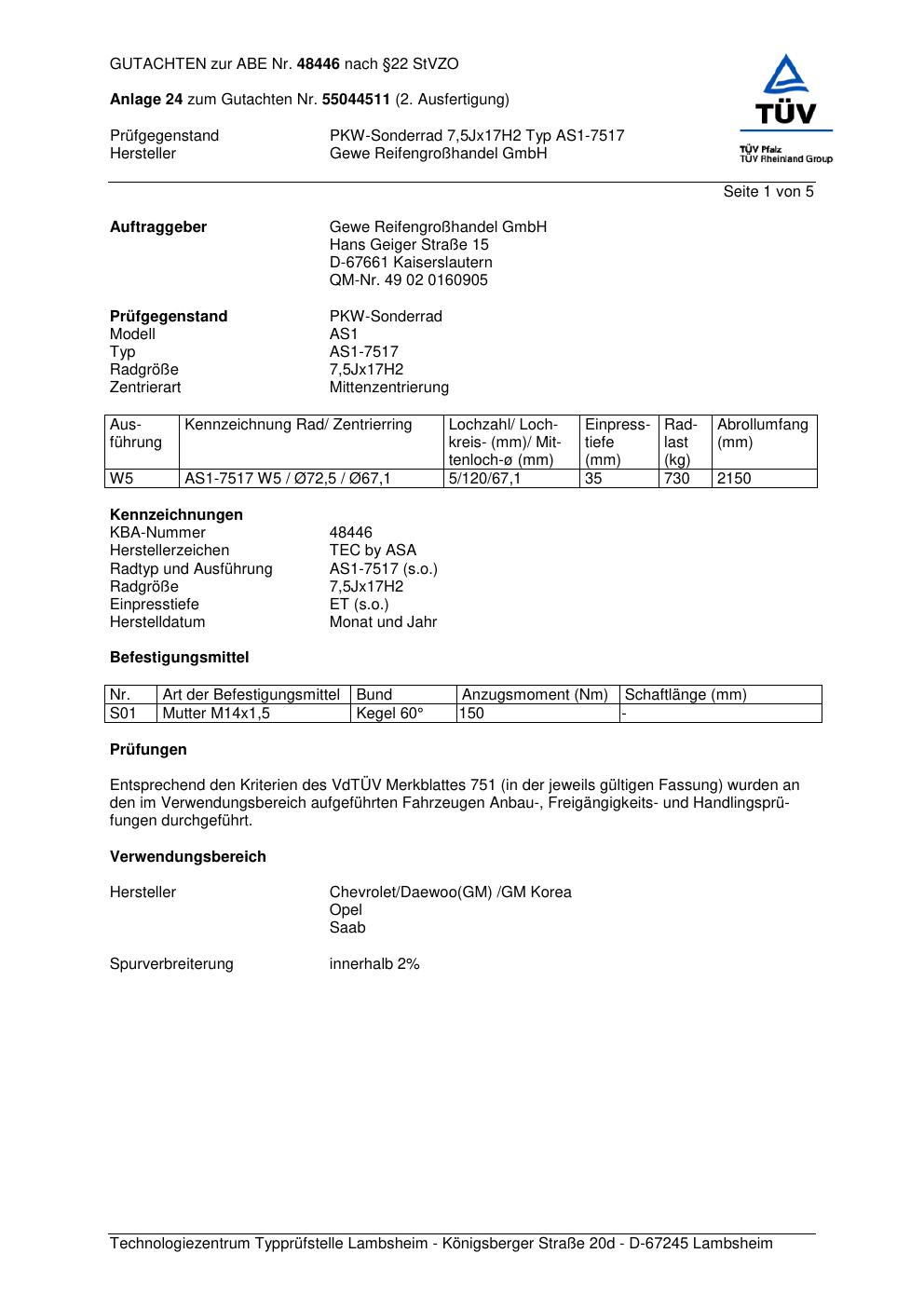 Dieses Gutachten (abe) bezieht sich auf die Alufelge GEWE AS1-7517 in der Ausführung ET 0, Mittenloch 0 mm (KBA 48446). Im PDF findest du typischerweise zulässige Reifengrößen, Auflagen/Anbauhinweise und – je nach Dokument – Hinweise zur Eintragung.