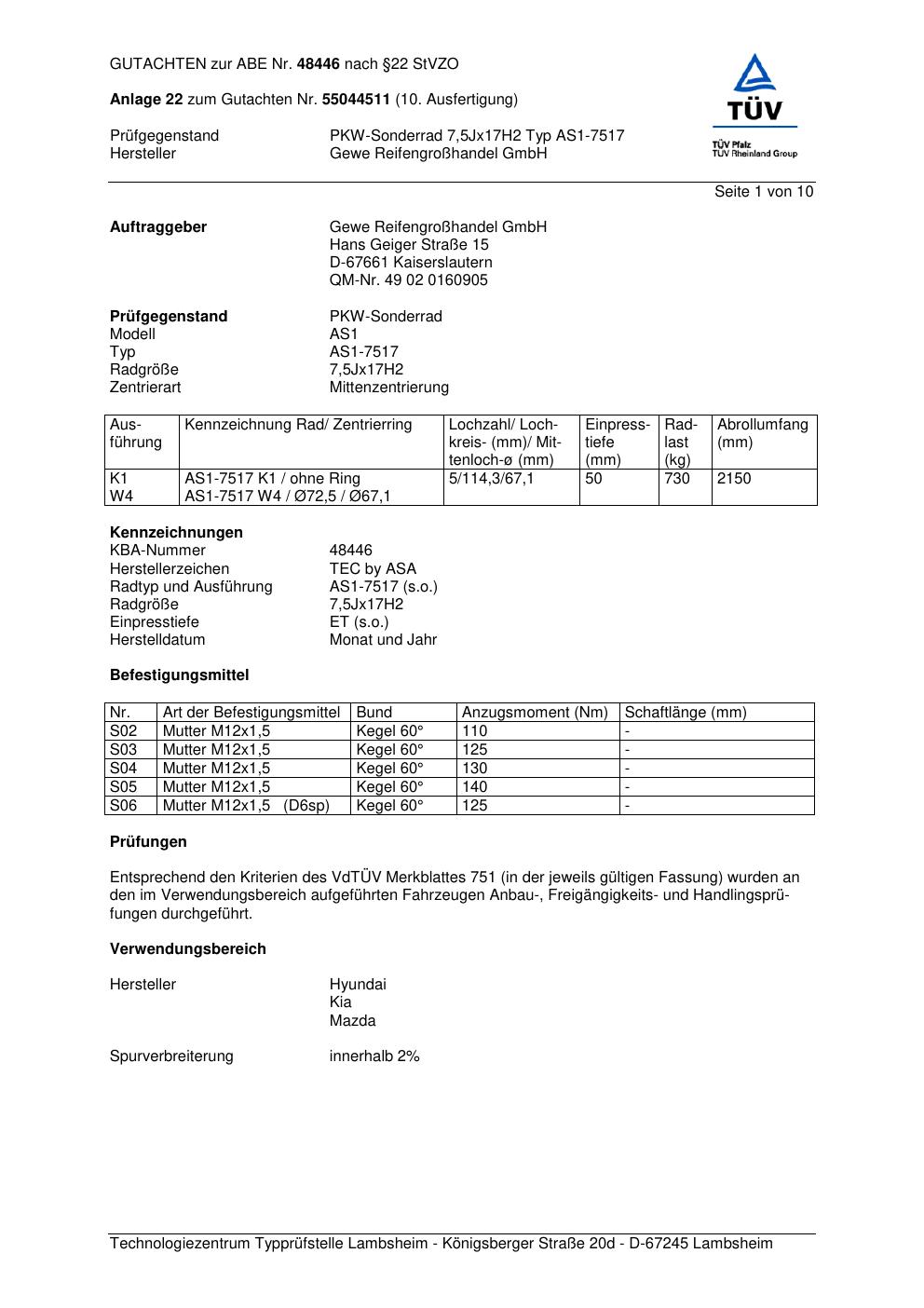Dieses Gutachten (abe) bezieht sich auf die Alufelge GEWE AS1-7517 in der Ausführung ET 0, Mittenloch 0 mm (KBA 48446). Im PDF findest du typischerweise zulässige Reifengrößen, Auflagen/Anbauhinweise und – je nach Dokument – Hinweise zur Eintragung.