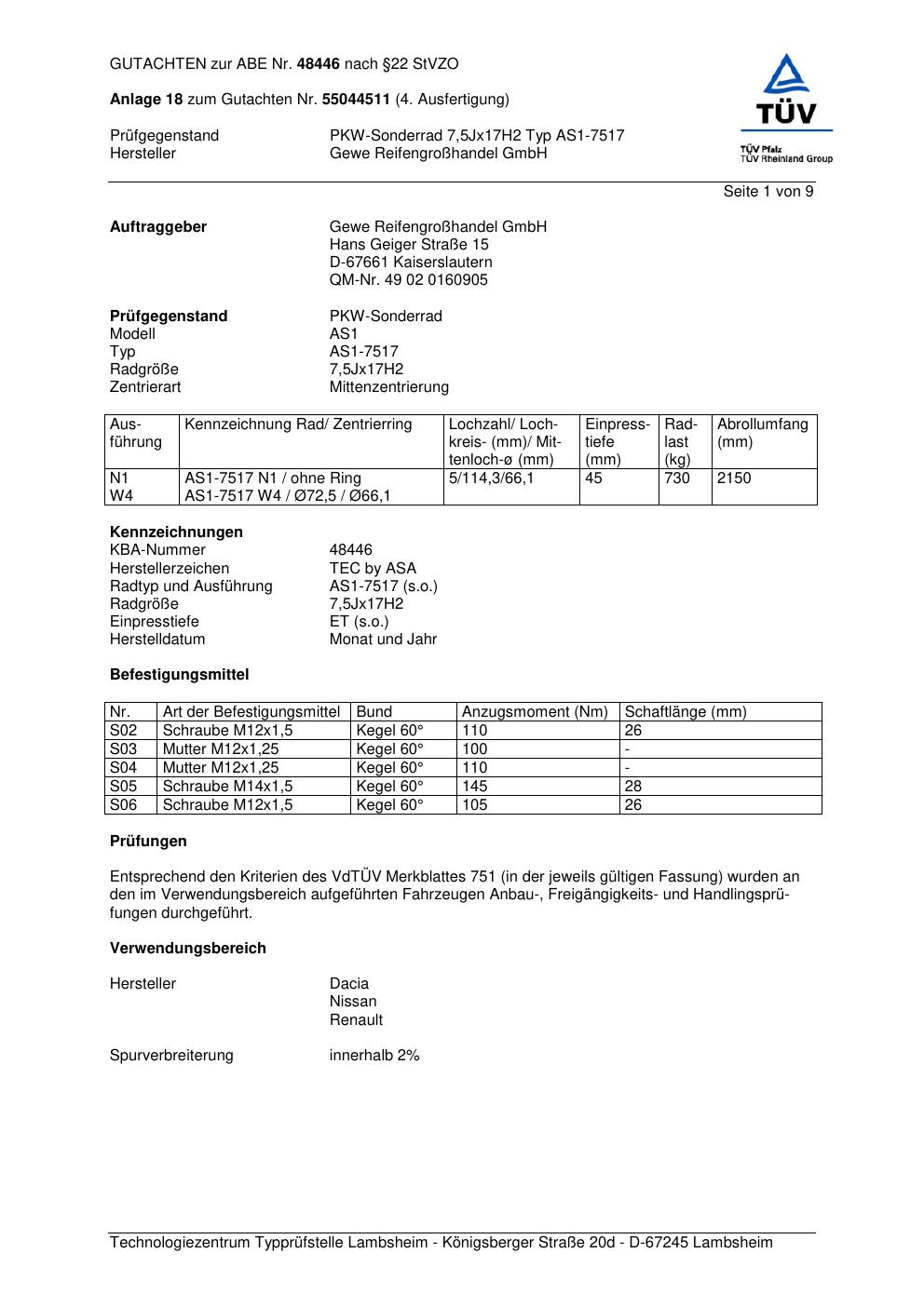 Dieses Gutachten (abe) bezieht sich auf die Alufelge GEWE AS1-7517 in der Ausführung ET 0, Mittenloch 0 mm (KBA 48446). Im PDF findest du typischerweise zulässige Reifengrößen, Auflagen/Anbauhinweise und – je nach Dokument – Hinweise zur Eintragung.