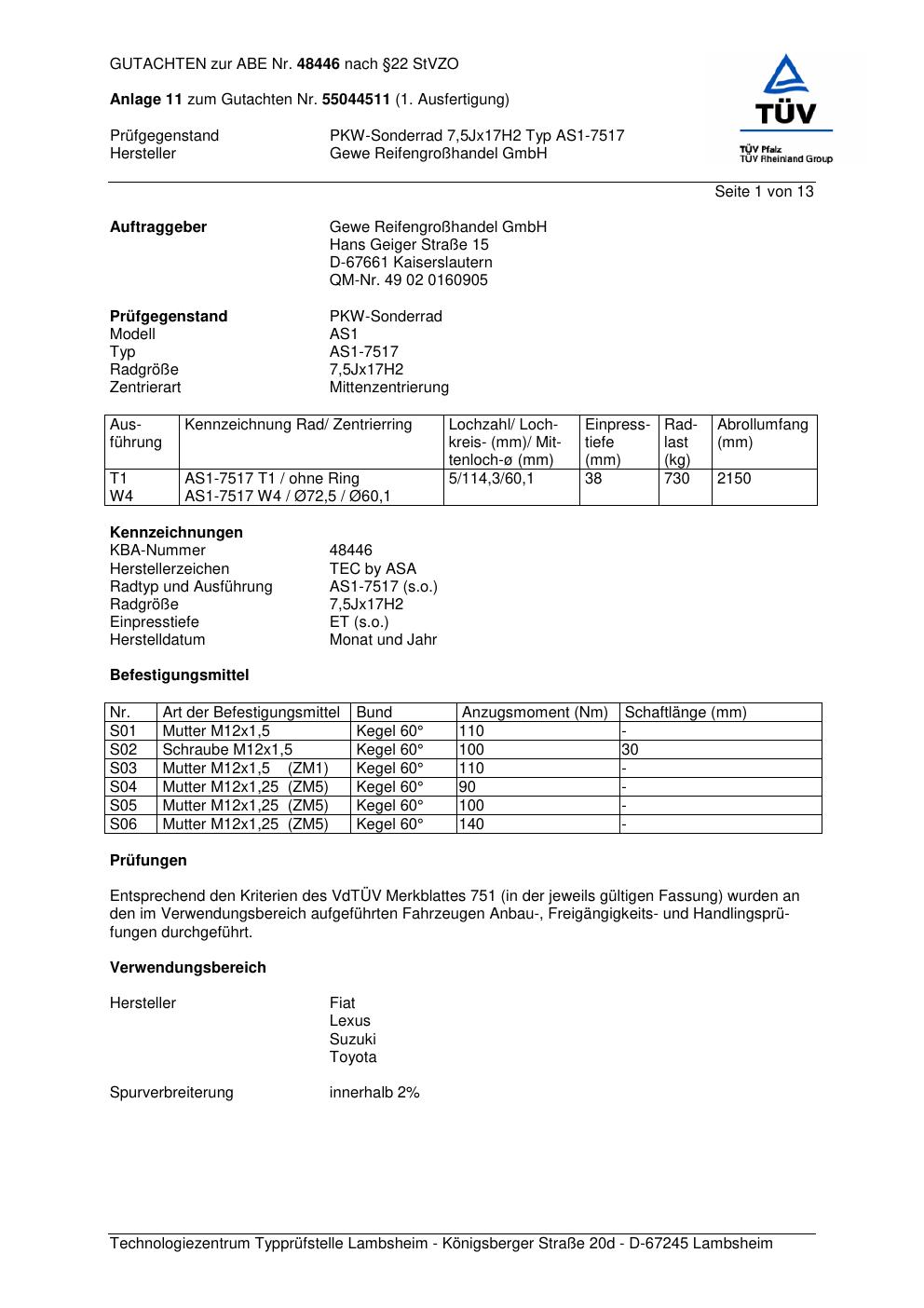 Dieses Gutachten (abe) bezieht sich auf die Alufelge GEWE AS1-7517 in der Ausführung ET 0, Mittenloch 0 mm (KBA 48446). Im PDF findest du typischerweise zulässige Reifengrößen, Auflagen/Anbauhinweise und – je nach Dokument – Hinweise zur Eintragung.