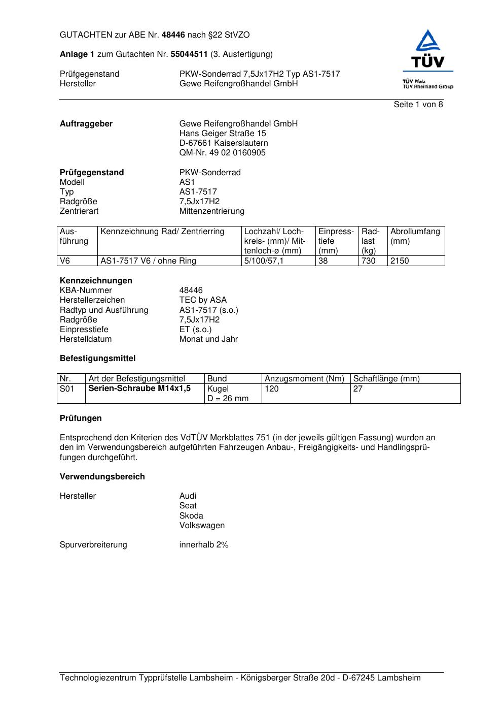 Dieses Gutachten (abe) bezieht sich auf die Alufelge GEWE AS1-7517 in der Ausführung ET 0, Mittenloch 0 mm (KBA 48446). Im PDF findest du typischerweise zulässige Reifengrößen, Auflagen/Anbauhinweise und – je nach Dokument – Hinweise zur Eintragung.