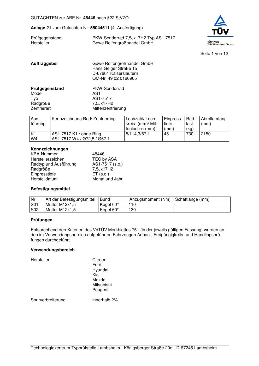 Dieses Gutachten (abe) bezieht sich auf die Alufelge GEWE AS1-7517 in der Ausführung ET 0, Mittenloch 0 mm (KBA 48446). Im PDF findest du typischerweise zulässige Reifengrößen, Auflagen/Anbauhinweise und – je nach Dokument – Hinweise zur Eintragung.