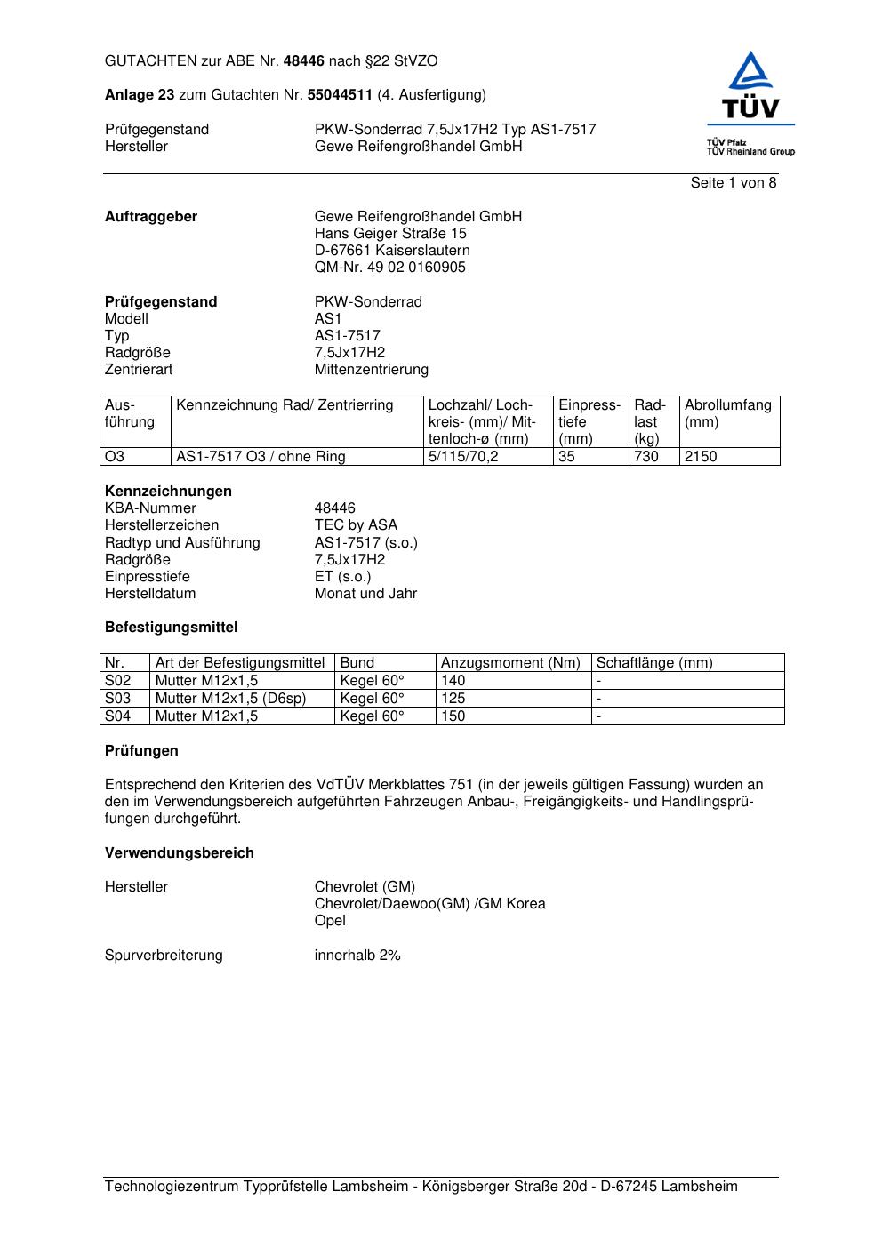 Dieses Gutachten (abe) bezieht sich auf die Alufelge GEWE AS1-7517 in der Ausführung ET 0, Mittenloch 0 mm (KBA 48446). Im PDF findest du typischerweise zulässige Reifengrößen, Auflagen/Anbauhinweise und – je nach Dokument – Hinweise zur Eintragung.