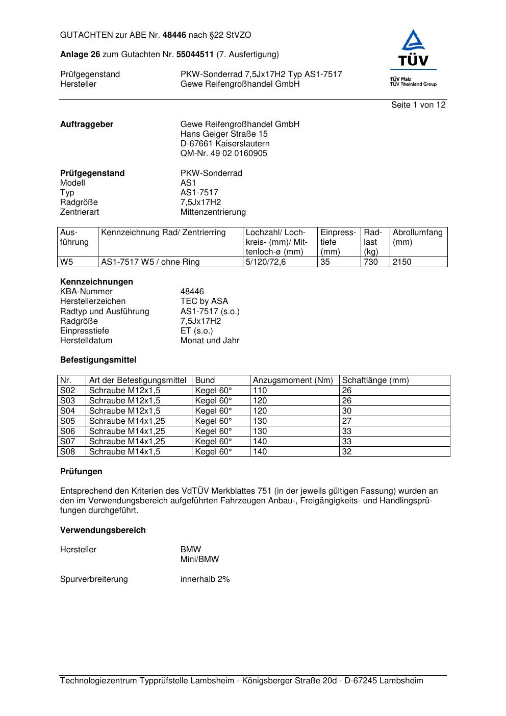 Dieses Gutachten (abe) bezieht sich auf die Alufelge GEWE AS1-7517 in der Ausführung ET 0, Mittenloch 0 mm (KBA 48446). Im PDF findest du typischerweise zulässige Reifengrößen, Auflagen/Anbauhinweise und – je nach Dokument – Hinweise zur Eintragung.