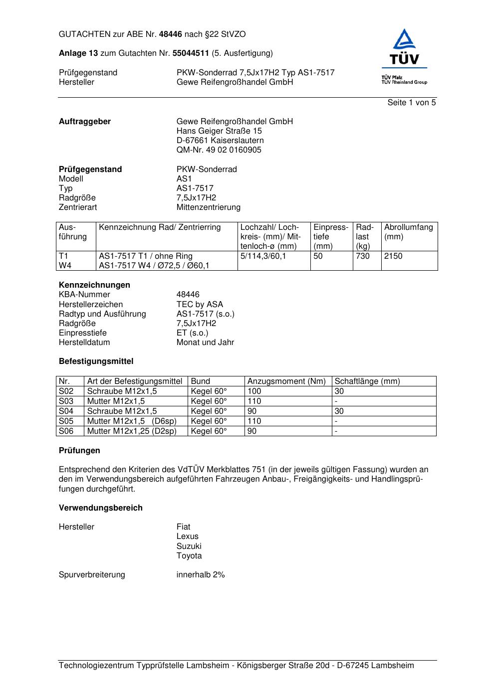 Dieses Gutachten (abe) bezieht sich auf die Alufelge GEWE AS1-7517 in der Ausführung ET 0, Mittenloch 0 mm (KBA 48446). Im PDF findest du typischerweise zulässige Reifengrößen, Auflagen/Anbauhinweise und – je nach Dokument – Hinweise zur Eintragung.