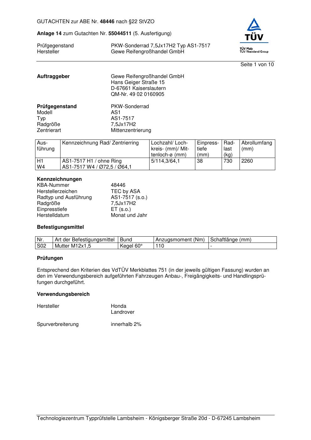 Dieses Gutachten (abe) bezieht sich auf die Alufelge Gewe Reifengro? AS1-7517 in der Ausführung ET 0, Mittenloch 0 mm (KBA 48446). Im PDF findest du typischerweise zulässige Reifengrößen, Auflagen/Anbauhinweise und – je nach Dokument – Hinweise zur Eintragung.