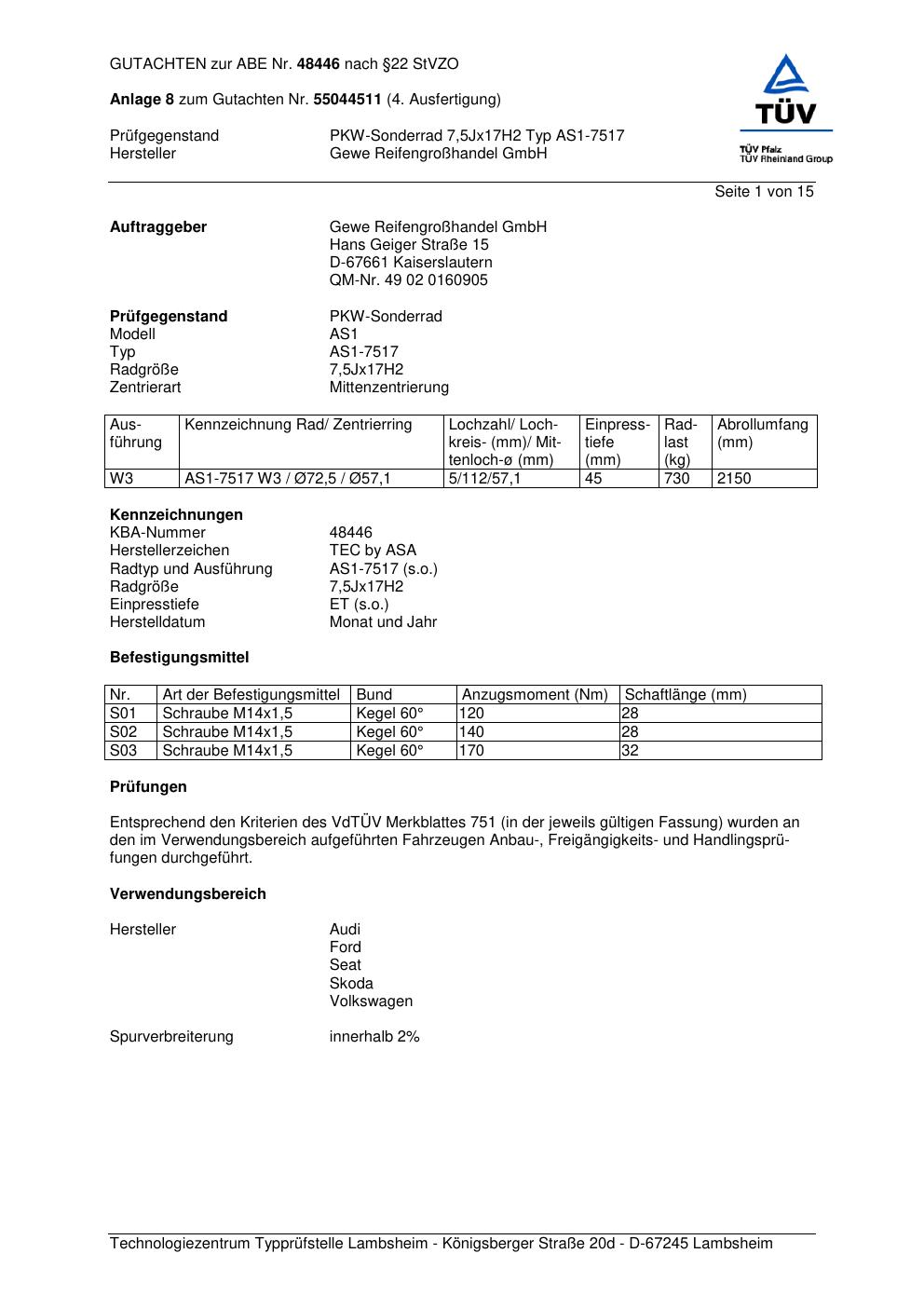 Dieses Gutachten (abe) bezieht sich auf die Alufelge GEWE AS1-7517 in der Ausführung ET 0, Mittenloch 0 mm (KBA 48446). Im PDF findest du typischerweise zulässige Reifengrößen, Auflagen/Anbauhinweise und – je nach Dokument – Hinweise zur Eintragung.