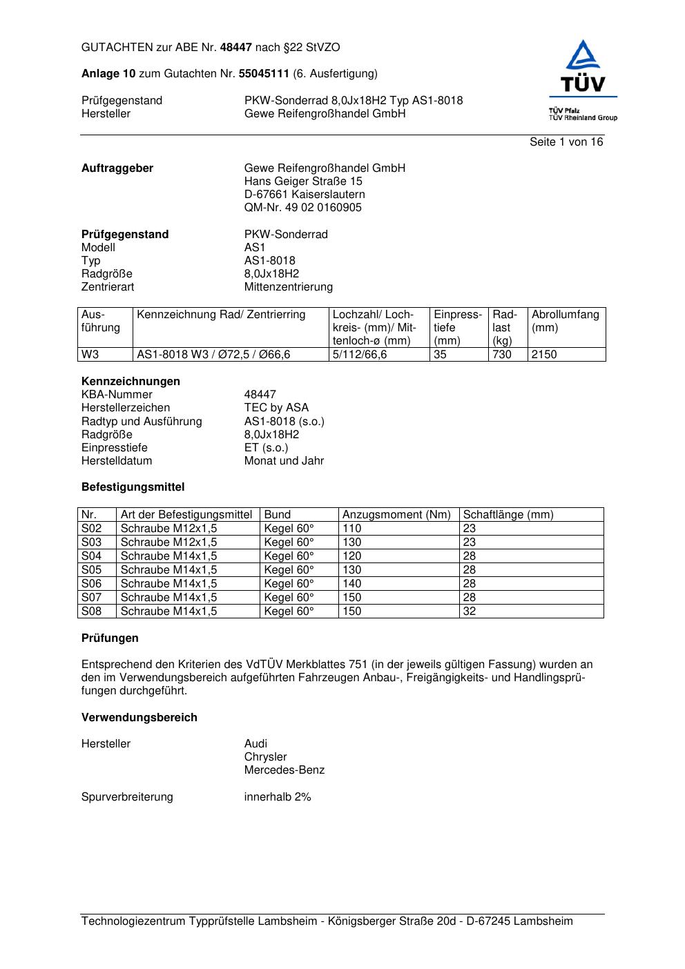 Dieses Gutachten (abe) bezieht sich auf die Alufelge GEWE AS1-8018 in der Ausführung ET 0, Mittenloch 0 mm (KBA 48447). Im PDF findest du typischerweise zulässige Reifengrößen, Auflagen/Anbauhinweise und – je nach Dokument – Hinweise zur Eintragung.