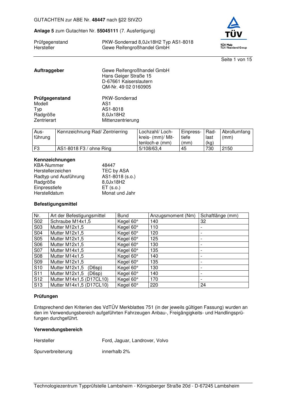 Dieses Gutachten (abe) bezieht sich auf die Alufelge GEWE AS1-8018 in der Ausführung ET 0, Mittenloch 0 mm (KBA 48447). Im PDF findest du typischerweise zulässige Reifengrößen, Auflagen/Anbauhinweise und – je nach Dokument – Hinweise zur Eintragung.
