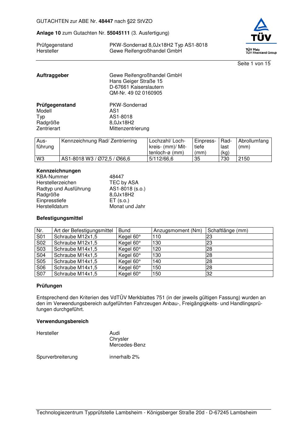 Dieses Gutachten (abe) bezieht sich auf die Alufelge GEWE AS1-8018 in der Ausführung ET 0, Mittenloch 0 mm (KBA 48447). Im PDF findest du typischerweise zulässige Reifengrößen, Auflagen/Anbauhinweise und – je nach Dokument – Hinweise zur Eintragung.