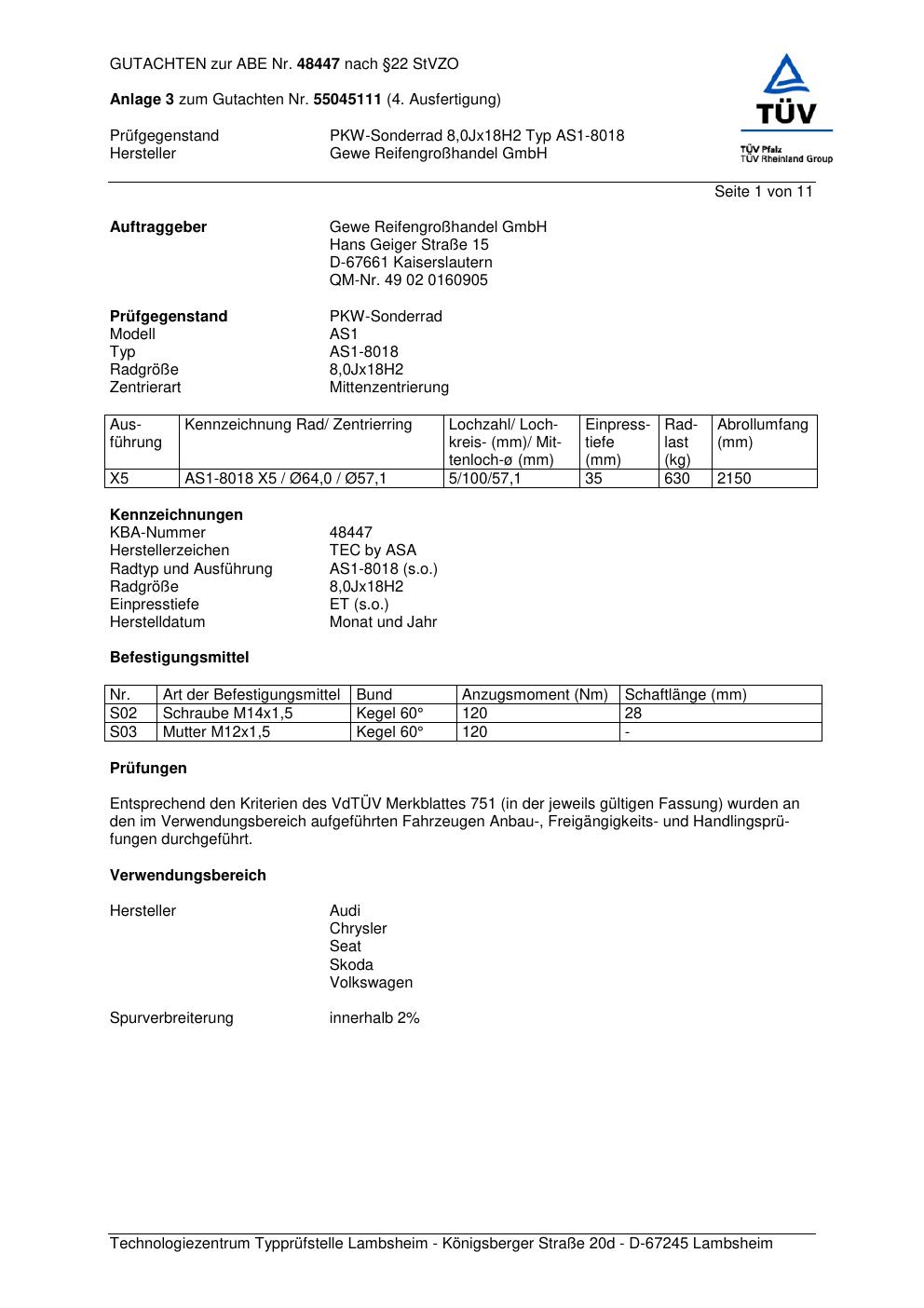 Dieses Gutachten (abe) bezieht sich auf die Alufelge GEWE AS1-8018 in der Ausführung ET 0, Mittenloch 0 mm (KBA 48447). Im PDF findest du typischerweise zulässige Reifengrößen, Auflagen/Anbauhinweise und – je nach Dokument – Hinweise zur Eintragung.