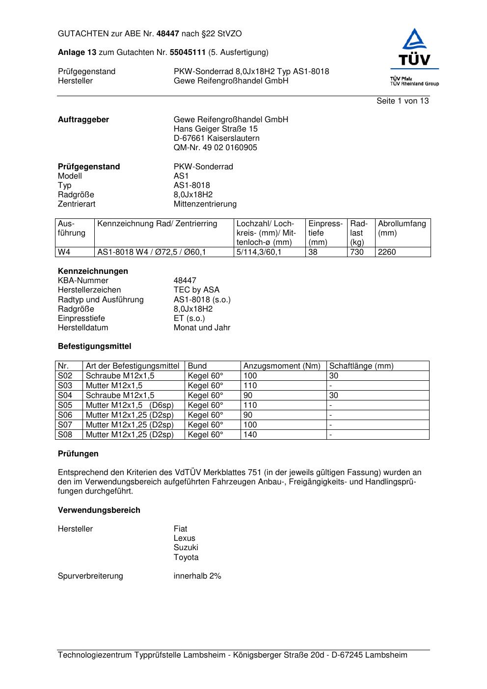 Dieses Gutachten (abe) bezieht sich auf die Alufelge GEWE AS1-8018 in der Ausführung ET 0, Mittenloch 0 mm (KBA 48447). Im PDF findest du typischerweise zulässige Reifengrößen, Auflagen/Anbauhinweise und – je nach Dokument – Hinweise zur Eintragung.