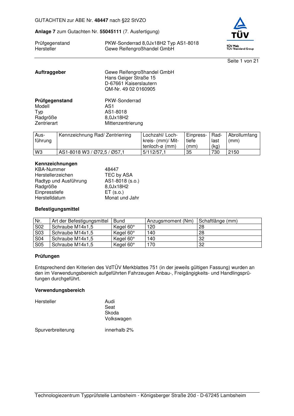 Dieses Gutachten (abe) bezieht sich auf die Alufelge GEWE AS1-8018 in der Ausführung ET 0, Mittenloch 0 mm (KBA 48447). Im PDF findest du typischerweise zulässige Reifengrößen, Auflagen/Anbauhinweise und – je nach Dokument – Hinweise zur Eintragung.