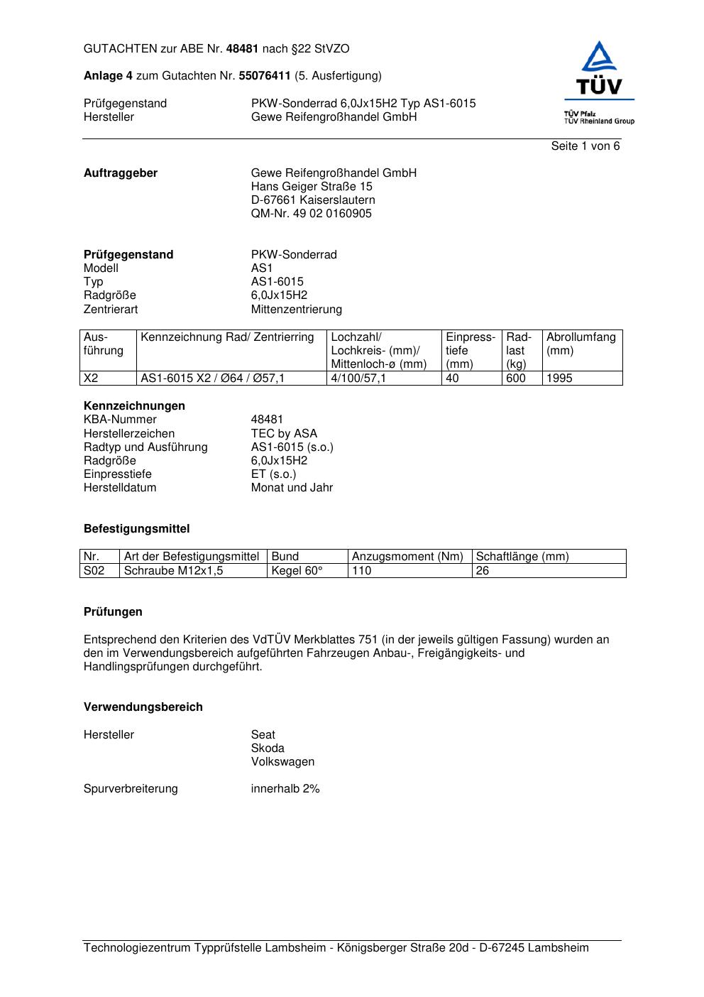 Dieses Gutachten (abe) bezieht sich auf die Alufelge GEWE AS1-6015 in der Ausführung ET 0, Mittenloch 0 mm (KBA 48481). Im PDF findest du typischerweise zulässige Reifengrößen, Auflagen/Anbauhinweise und – je nach Dokument – Hinweise zur Eintragung.