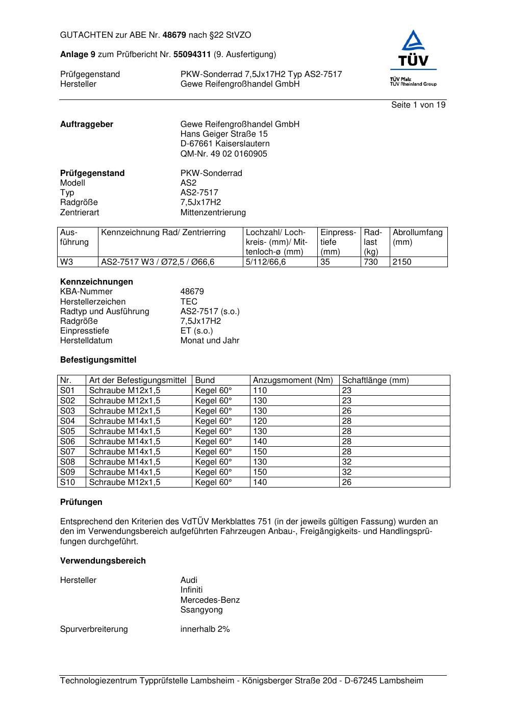 Dieses Gutachten (abe) bezieht sich auf die Alufelge GEWE AS2-7517 in der Ausführung ET 0, Mittenloch 0 mm (KBA 48679). Im PDF findest du typischerweise zulässige Reifengrößen, Auflagen/Anbauhinweise und – je nach Dokument – Hinweise zur Eintragung.