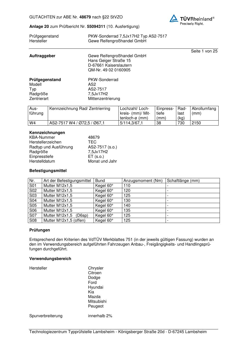 Dieses Gutachten (abe) bezieht sich auf die Alufelge GEWE AS2-7517 in der Ausführung ET 0, Mittenloch 0 mm (KBA 48679). Im PDF findest du typischerweise zulässige Reifengrößen, Auflagen/Anbauhinweise und – je nach Dokument – Hinweise zur Eintragung.