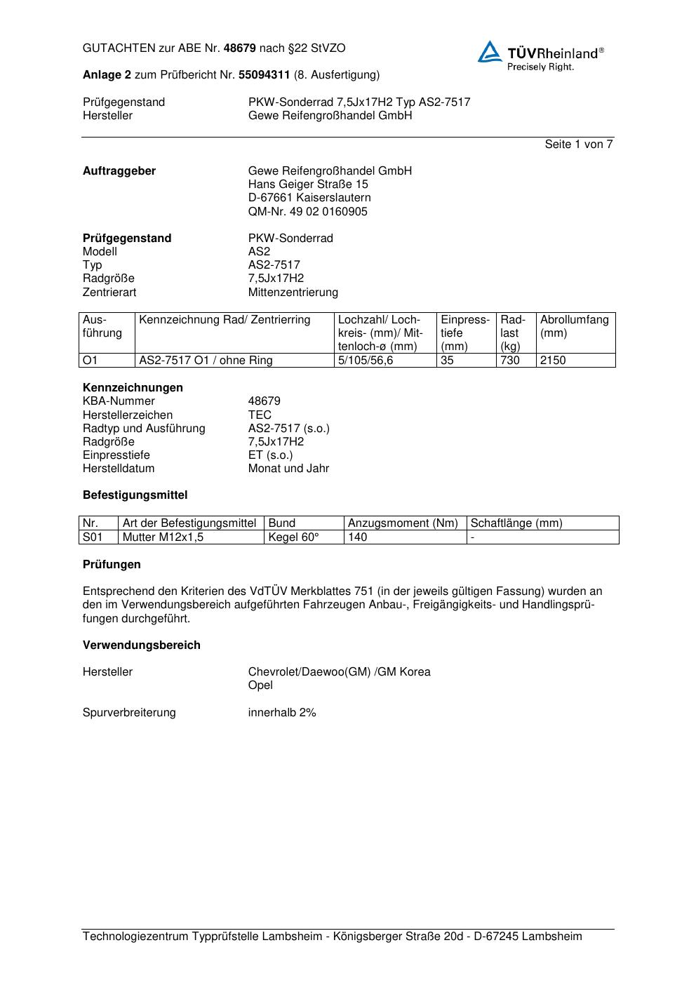 Dieses Gutachten (abe) bezieht sich auf die Alufelge GEWE AS2-7517 in der Ausführung ET 0, Mittenloch 0 mm (KBA 48679). Im PDF findest du typischerweise zulässige Reifengrößen, Auflagen/Anbauhinweise und – je nach Dokument – Hinweise zur Eintragung.