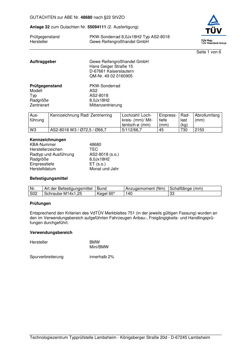 Dieses Gutachten (abe) bezieht sich auf die Alufelge GEWE AS2-8018 in der Ausführung ET 0, Mittenloch 0 mm (KBA 48680). Im PDF findest du typischerweise zulässige Reifengrößen, Auflagen/Anbauhinweise und – je nach Dokument – Hinweise zur Eintragung.