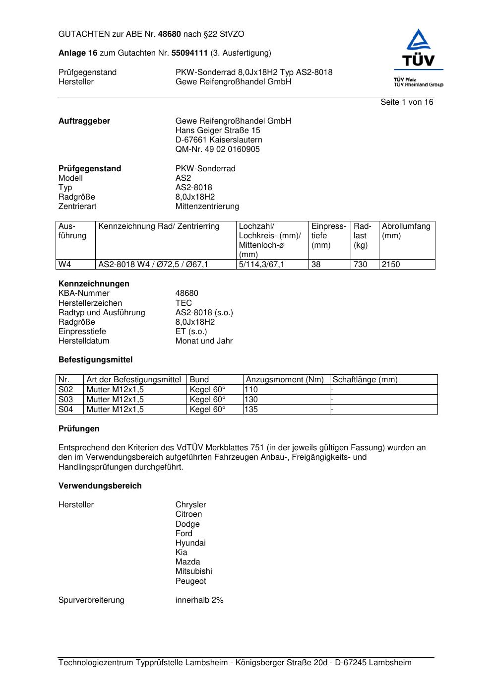 Dieses Gutachten (abe) bezieht sich auf die Alufelge GEWE AS2-8018 in der Ausführung ET 0, Mittenloch 0 mm (KBA 48680). Im PDF findest du typischerweise zulässige Reifengrößen, Auflagen/Anbauhinweise und – je nach Dokument – Hinweise zur Eintragung.