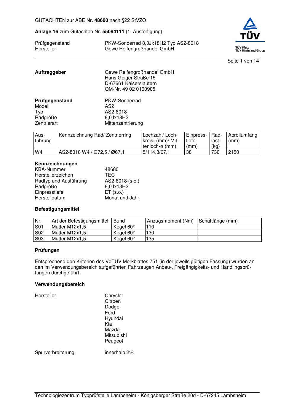 Dieses Gutachten (abe) bezieht sich auf die Alufelge GEWE AS2-8018 in der Ausführung ET 0, Mittenloch 0 mm (KBA 48680). Im PDF findest du typischerweise zulässige Reifengrößen, Auflagen/Anbauhinweise und – je nach Dokument – Hinweise zur Eintragung.