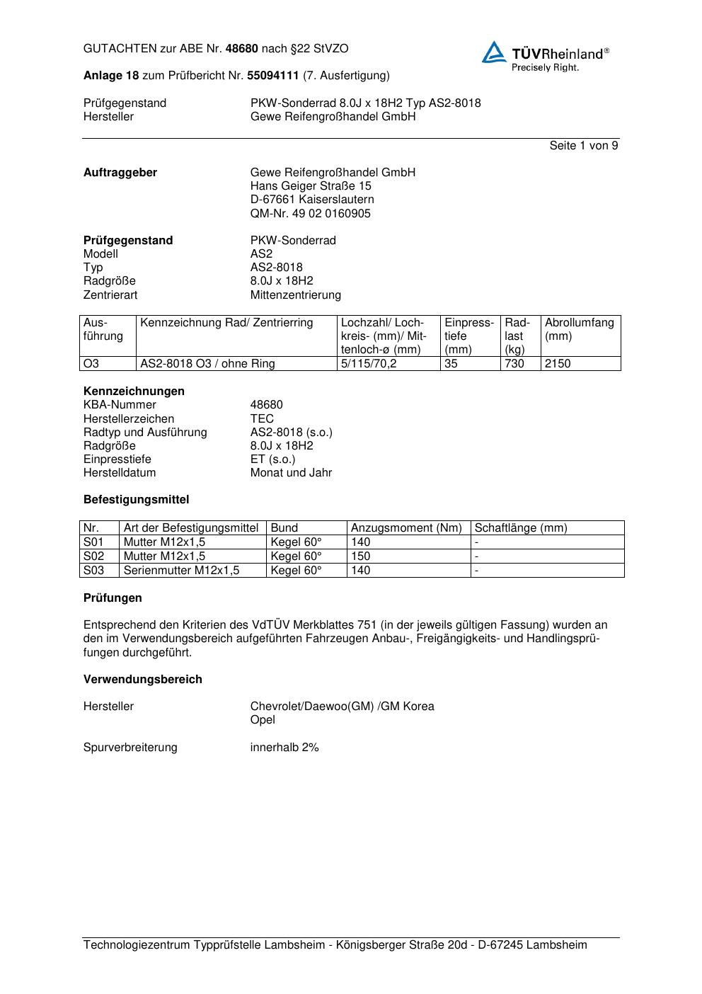 Dieses Gutachten (abe) bezieht sich auf die Alufelge GEWE AS2-80 18 in der Ausführung ET 0, Mittenloch 0 mm (KBA 48680). Im PDF findest du typischerweise zulässige Reifengrößen, Auflagen/Anbauhinweise und – je nach Dokument – Hinweise zur Eintragung.