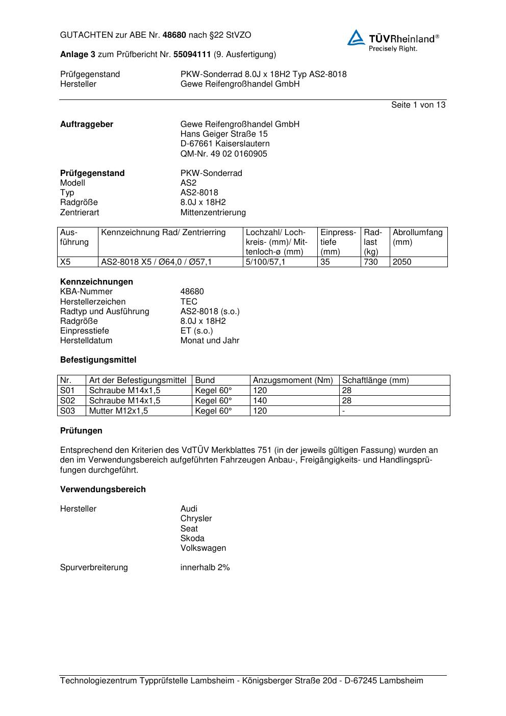 Felgengutachten / abe für Alufelgen Gewe Reifengroffengrohand... AS2-8018 (ET 0, Mittenloch 0 mm) mit KBA 48680 (Zertifikatsnummer 48680). Hier kostenlos als PDF herunterladen. Der Download-Link ist 24 Stunden gültig und kann bis zu zwei Mal verwendet werden.