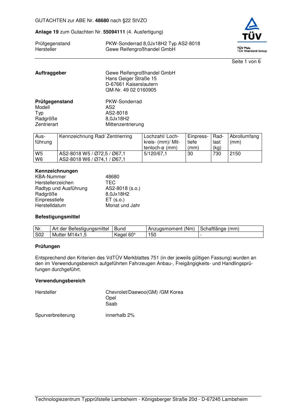 Dieses Gutachten (abe) bezieht sich auf die Alufelge GEWE AS2-8018 in der Ausführung ET 0, Mittenloch 0 mm (KBA 48680). Im PDF findest du typischerweise zulässige Reifengrößen, Auflagen/Anbauhinweise und – je nach Dokument – Hinweise zur Eintragung.