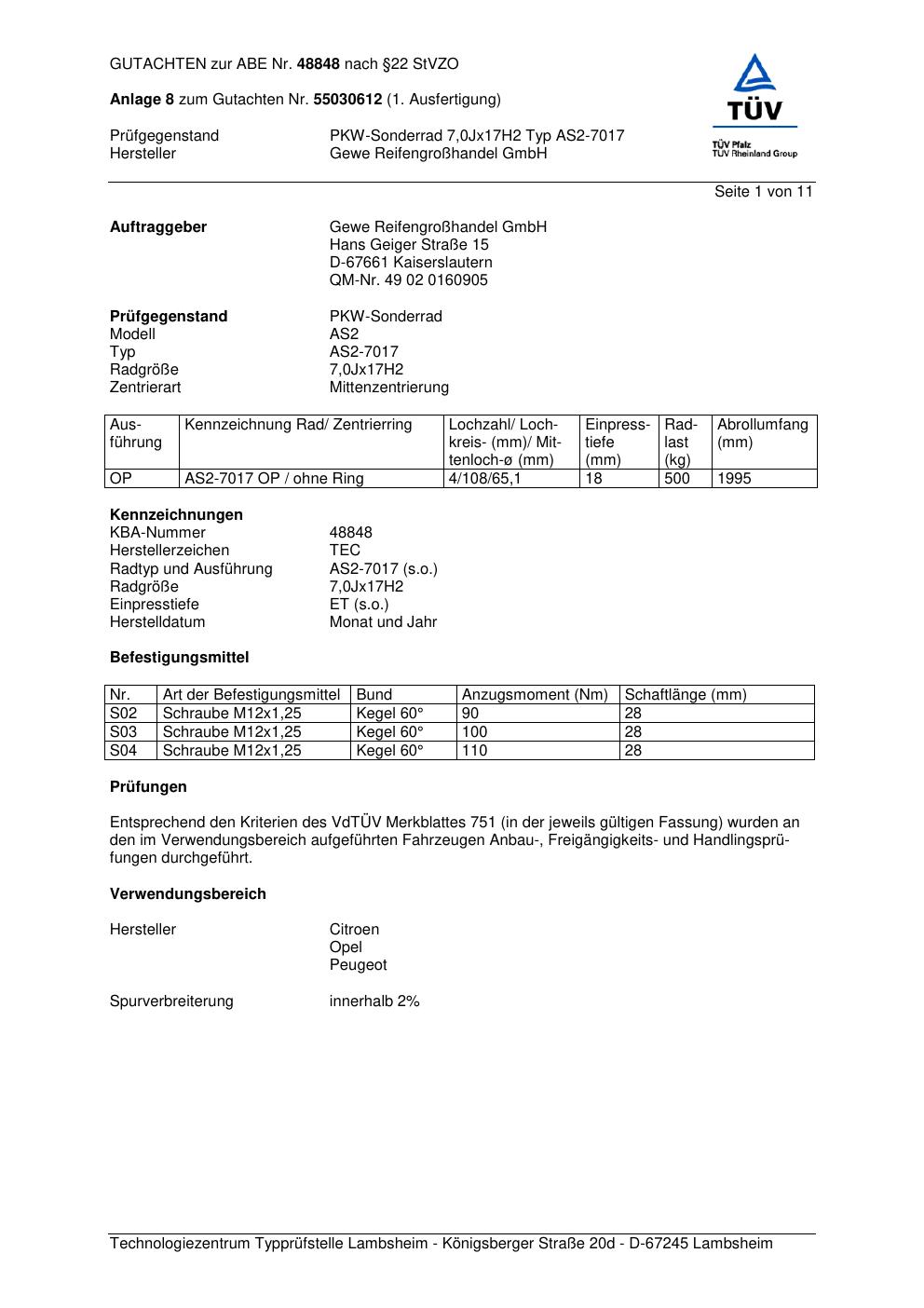 Dieses Gutachten (abe) bezieht sich auf die Alufelge GEWE AS2-7017 in der Ausführung ET 0, Mittenloch 0 mm (KBA 48848). Im PDF findest du typischerweise zulässige Reifengrößen, Auflagen/Anbauhinweise und – je nach Dokument – Hinweise zur Eintragung.