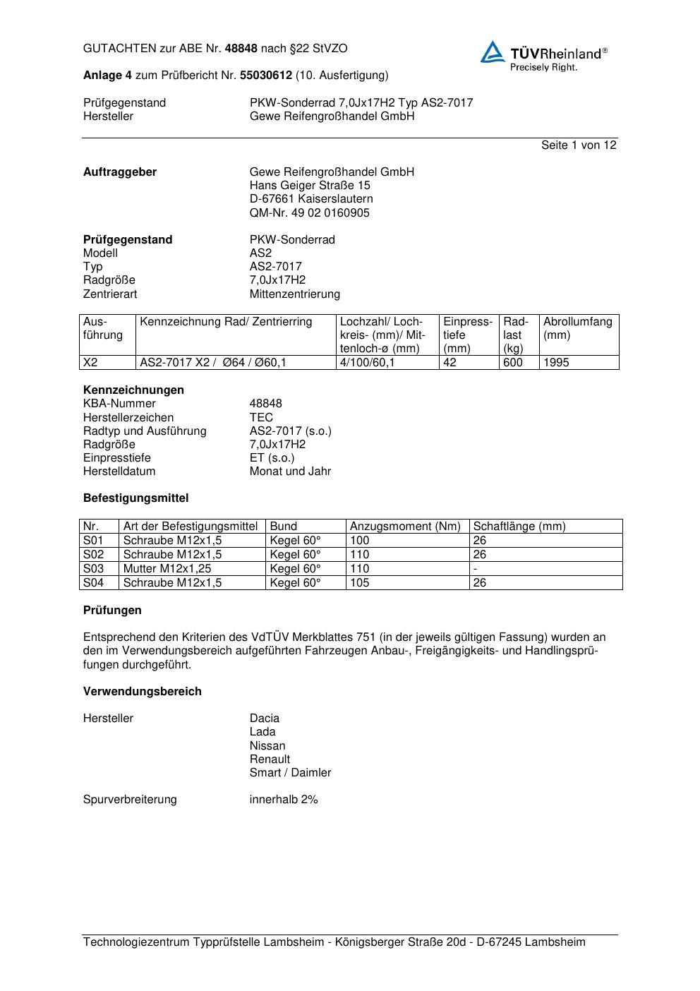 Dieses Gutachten (abe) bezieht sich auf die Alufelge Gewe Reifengroengrohandel GmbH AS2-7017 in der Ausführung ET 0, Mittenloch 0 mm (KBA 48848). Im PDF findest du typischerweise zulässige Reifengrößen, Auflagen/Anbauhinweise und – je nach Dokument – Hinweise zur Eintragung.