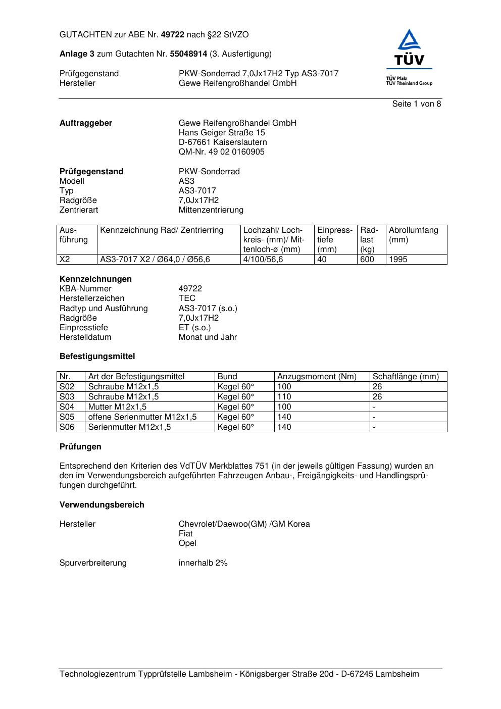 Dieses Gutachten (abe) bezieht sich auf die Alufelge GEWE AS3-7017 in der Ausführung ET 0, Mittenloch 0 mm (KBA 49722). Im PDF findest du typischerweise zulässige Reifengrößen, Auflagen/Anbauhinweise und – je nach Dokument – Hinweise zur Eintragung.