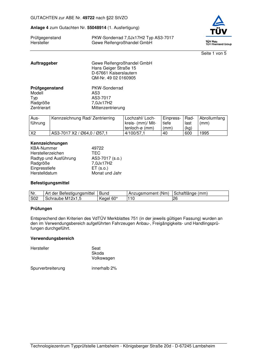 Dieses Gutachten (abe) bezieht sich auf die Alufelge GEWE AS3-7017 in der Ausführung ET 0, Mittenloch 0 mm (KBA 49722). Im PDF findest du typischerweise zulässige Reifengrößen, Auflagen/Anbauhinweise und – je nach Dokument – Hinweise zur Eintragung.
