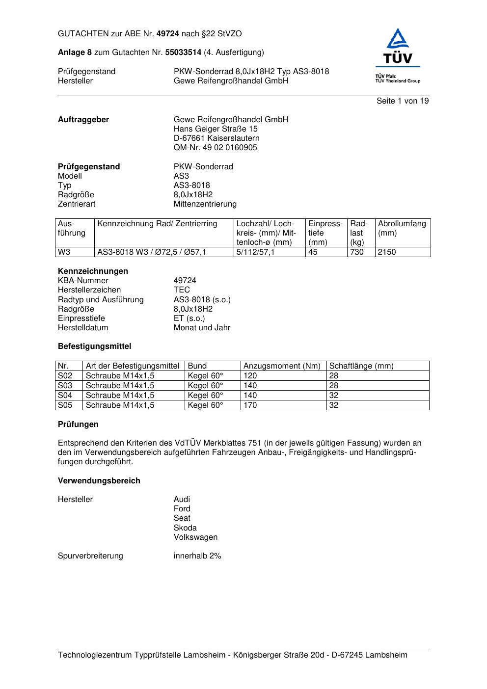 Dieses Gutachten (abe) bezieht sich auf die Alufelge GEWE AS3-8018 in der Ausführung ET 0, Mittenloch 0 mm (KBA 49724). Im PDF findest du typischerweise zulässige Reifengrößen, Auflagen/Anbauhinweise und – je nach Dokument – Hinweise zur Eintragung.
