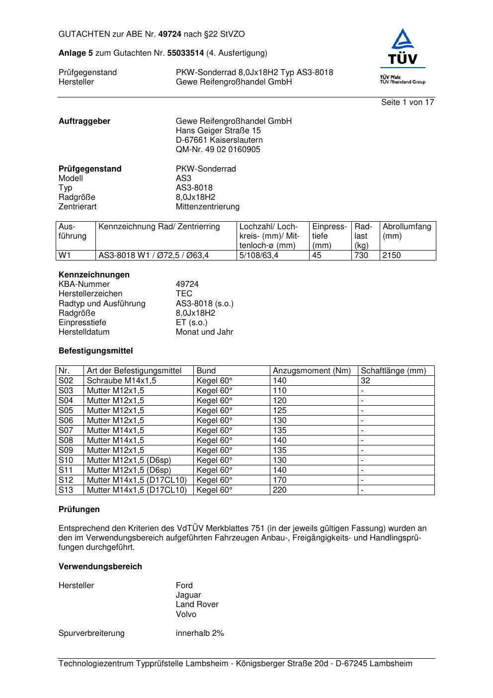 Dieses Gutachten (abe) bezieht sich auf die Alufelge GEWE AS3-8018 in der Ausführung ET 0, Mittenloch 0 mm (KBA 49724). Im PDF findest du typischerweise zulässige Reifengrößen, Auflagen/Anbauhinweise und – je nach Dokument – Hinweise zur Eintragung.