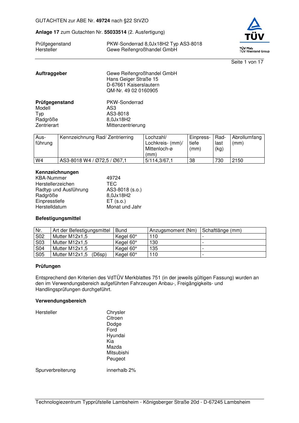 Dieses Gutachten (abe) bezieht sich auf die Alufelge GEWE AS3-8018 in der Ausführung ET 0, Mittenloch 0 mm (KBA 49724). Im PDF findest du typischerweise zulässige Reifengrößen, Auflagen/Anbauhinweise und – je nach Dokument – Hinweise zur Eintragung.