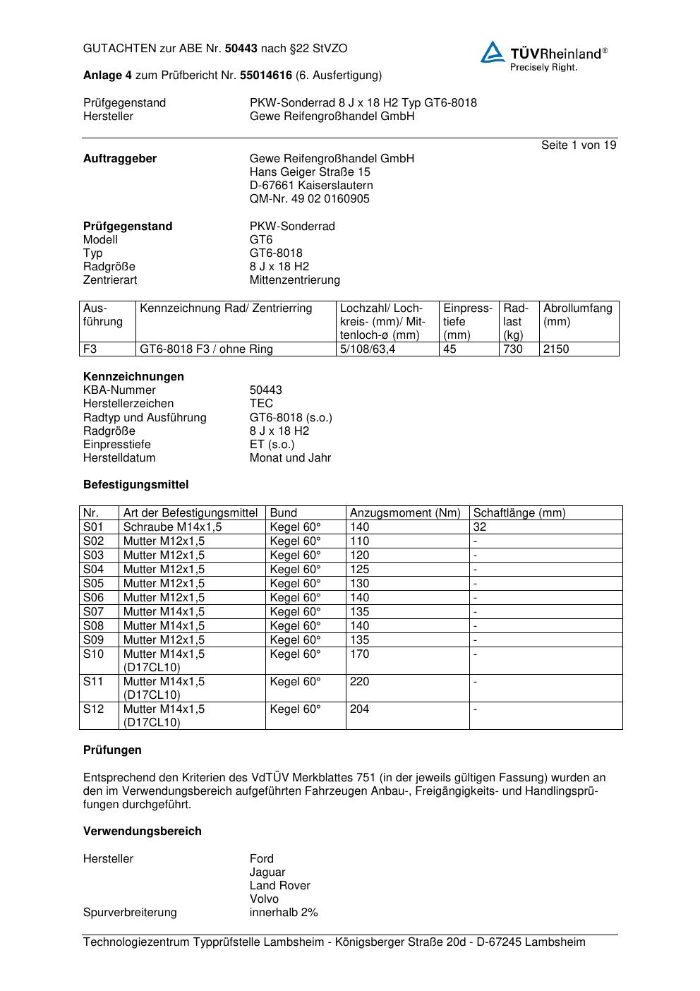 Dieses Gutachten (abe) bezieht sich auf die Alufelge GEWE GT6-8018 in der Ausführung ET 0, Mittenloch 0 mm (KBA 50443). Im PDF findest du typischerweise zulässige Reifengrößen, Auflagen/Anbauhinweise und – je nach Dokument – Hinweise zur Eintragung.