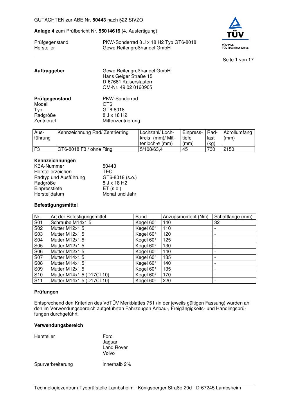 Dieses Gutachten (abe) bezieht sich auf die Alufelge GEWE GT6-8018 in der Ausführung ET 0, Mittenloch 0 mm (KBA 50443). Im PDF findest du typischerweise zulässige Reifengrößen, Auflagen/Anbauhinweise und – je nach Dokument – Hinweise zur Eintragung.