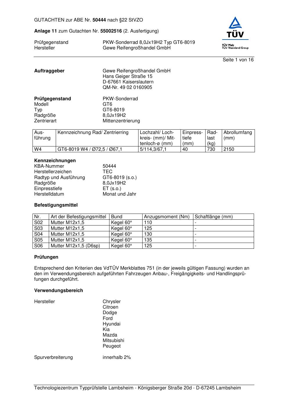 Dieses Gutachten (abe) bezieht sich auf die Alufelge GEWE GT6-8019 in der Ausführung ET 0, Mittenloch 0 mm (KBA 50444). Im PDF findest du typischerweise zulässige Reifengrößen, Auflagen/Anbauhinweise und – je nach Dokument – Hinweise zur Eintragung.