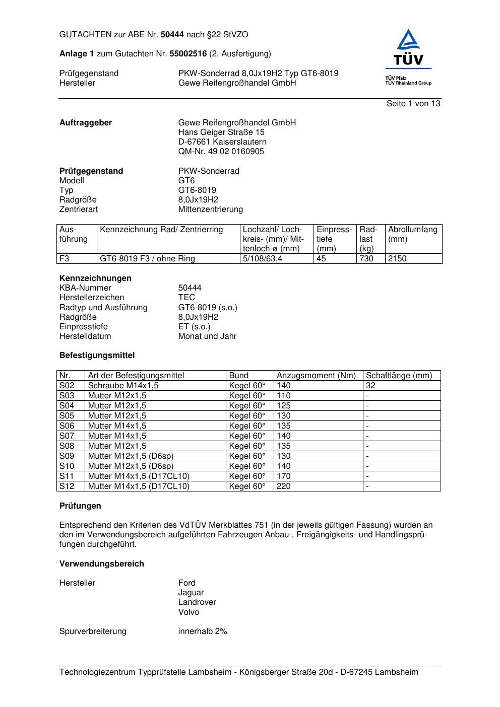 Dieses Gutachten (abe) bezieht sich auf die Alufelge Gewe Reifengrodfhandel GmbH GT6-8019 in der Ausführung ET 0, Mittenloch 0 mm (KBA 50444). Im PDF findest du typischerweise zulässige Reifengrößen, Auflagen/Anbauhinweise und – je nach Dokument – Hinweise zur Eintragung.