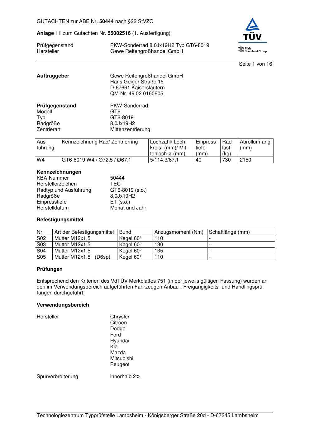 Dieses Gutachten (abe) bezieht sich auf die Alufelge GEWE GT6-8019 in der Ausführung ET 0, Mittenloch 0 mm (KBA 50444). Im PDF findest du typischerweise zulässige Reifengrößen, Auflagen/Anbauhinweise und – je nach Dokument – Hinweise zur Eintragung.